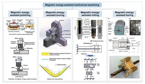 При токарной обработке внешнее магнитное поле может обеспечить вихревое демпфирование детали, которое компенсирует вибрацию при обработке. Снижается вибрация, увеличивается долговечность инструмента и повышается геометрическая точность поверхности. В одном из экспериментов шероховатость поверхности снизилась на 55%, а усилие резания на 66%. Кроме того, образовывалась длинная непрерывная и гладкая стружка, что говорит о стабильном режиме резания. Погрешность формы образцов из титанового сплава Ti-6Al-4V составила менее 4%, в то время как для обычной токарной обработки эта цифра лежит в диапазоне 25–37%.