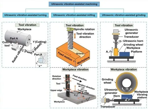 В сочетании с традиционными методами механической обработки (токарные, фрезерные, шлифовальные операции) ультразвук (>20 кГц) меняет траекторию инструмента и заготовки. Например, когда колебания передавались на токарный резец, то режим удаления материала сменялся с непрерывного на прерывистый, а усилие резания снижалось на 40%.