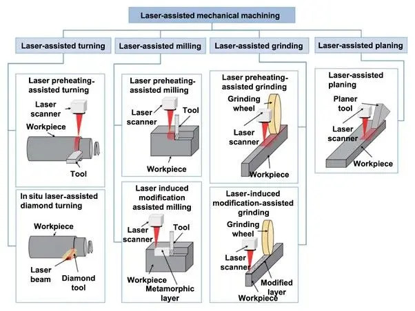 Механическая обработка с использованием лазера построена либо на предварительном нагреве, либо на испарении, либо на изменении микроструктуры материала детали. К примеру, при повышенной температуре механизм деформации керамики и цементированных карбидов меняется с хрупкого на пластичный, а это напрямую влияет на качество поверхности.