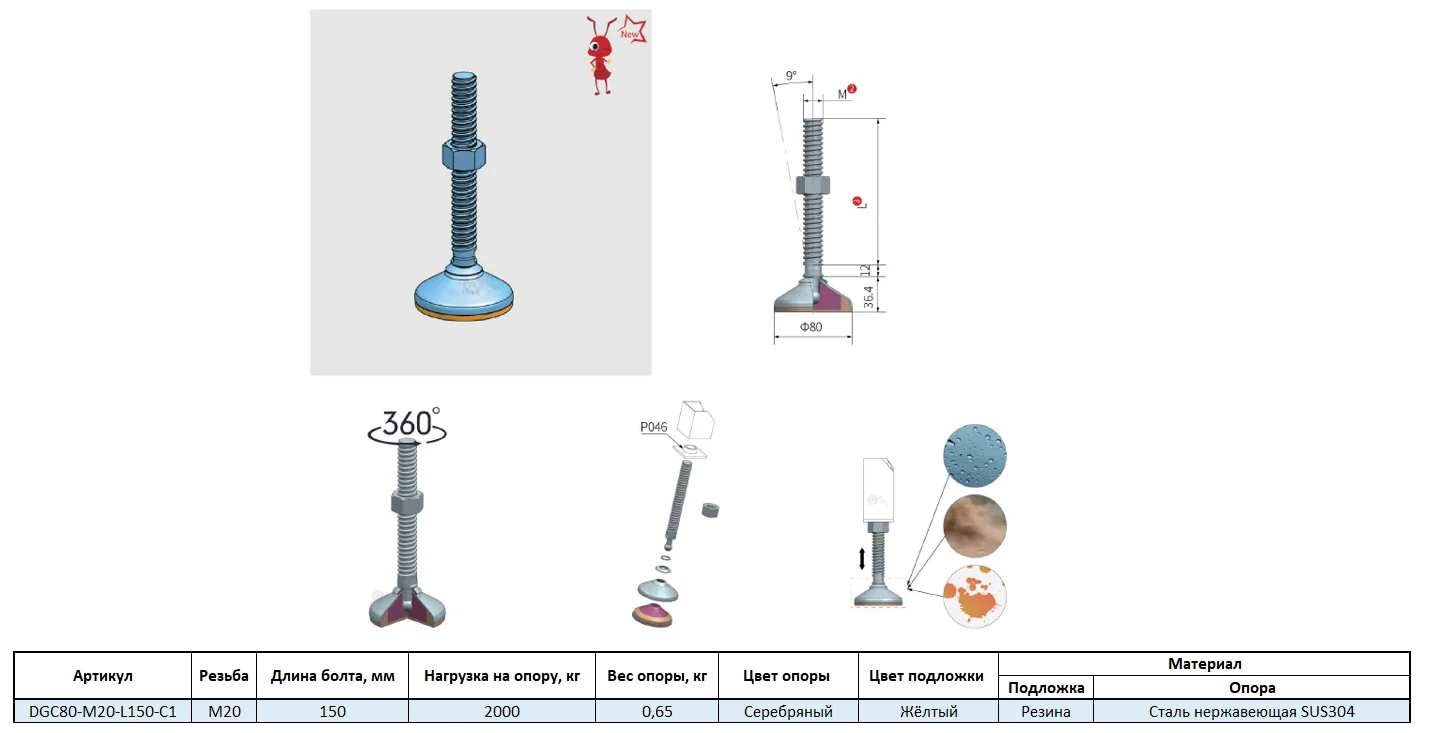Материал основания и резьбового болта - Сталь нержавеющая SUS3