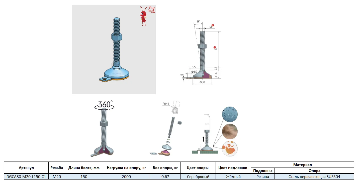 Материал основания и резьбового стержня - Сталь нержавеющая SUS304