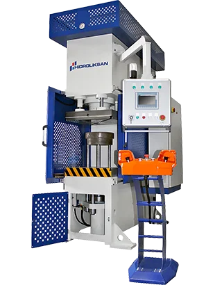 Гидравлические С-образные глубоковытяжные прессы — С-образные прессы глубокой вытяжки с усилием до 500 тонн, и в основном стандартного размера, но по требованию пользователя можно подготовить определенный размер стола и другие параметры. Из-за своей С-образной конструкции, пространство в станине увеличивается, но прочность уменьшается. Максимальный рекомендуемый размер стола для таких станков — 1000×1000 мм. Данный тип прессов больше подходит для процесса глубокой вытяжки с маленькими формами, так как они занимают меньше места в производстве. Выталкивающий ролик, размещенный в верхней части стола, ускоряет и упрощает процесс извлечения. Обработанные с высокой точностью ползун и стол дают возможность обеспечивать точные размеры готовой продукции. При большем размере стола, чем 1000×1000мм, будет предлагаться другой тип станка — из серии Н.