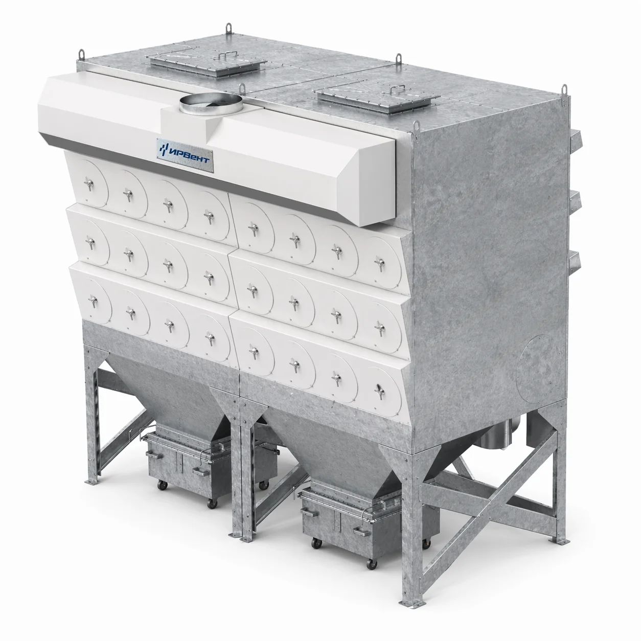 Вытяжная фильтр-вентиляционная установка (ФВУ) IRVENT-24 представляет собой отдельный корпус с фильтрующими картриджами и радиальный вентилятор в шумозащитном коробе. Очищенный воздух выводится в атмосферу. Очистка фильтров сжатым воздухом производится автоматически, при активации электромагнитных клапанов по сигналу с шкафа управления ФВУ IRVENT-24. Пыль, выдуваемая из фильтров сжатым воздухом, попадает в выдвижную тележку, установленную под бункером.