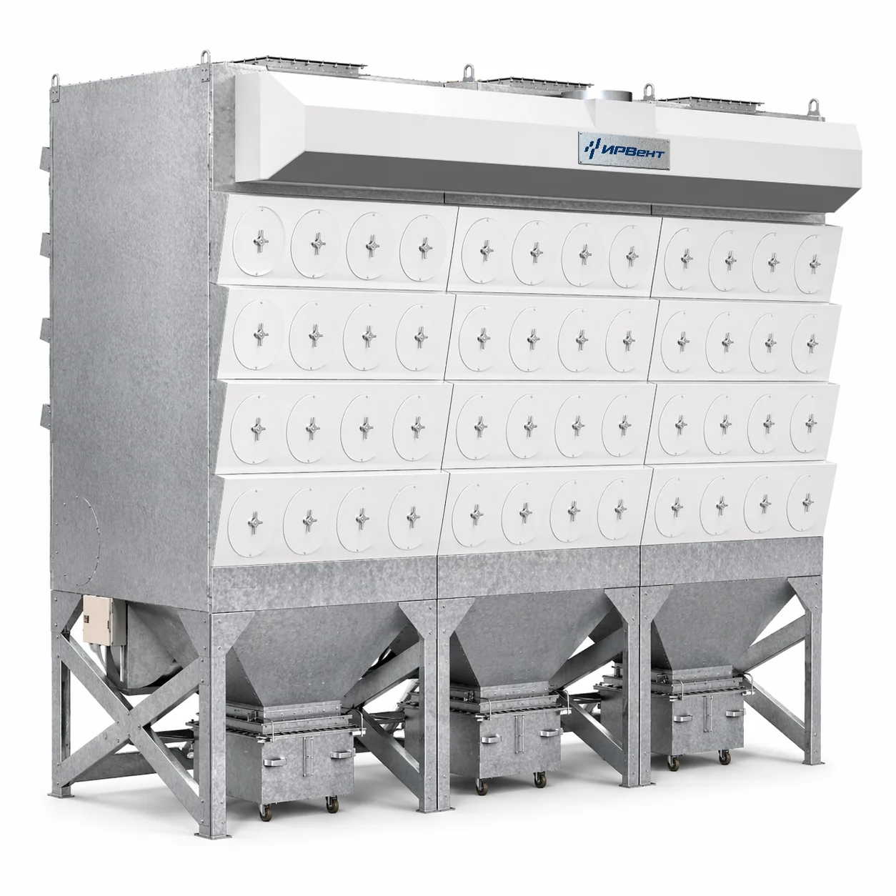 Вытяжная фильтр-вентиляционная установка (ФВУ) IRVENT-48 представляет собой отдельный корпус с фильтрующими картриджами и радиальный вентилятор в шумозащитном коробе. Очищенный воздух выводится в атмосферу. Очистка фильтров сжатым воздухом производится автоматически, при активации электромагнитных клапанов по сигналу с шкафа управления ФВУ IRVENT-48. Пыль, выдуваемая из фильтров сжатым воздухом, попадает в выдвижную тележку, установленную под бункером.