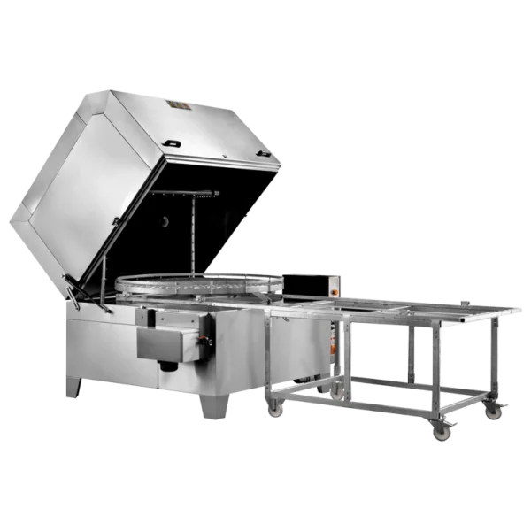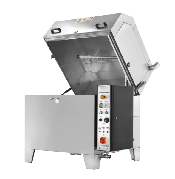 Мойка производится в полностью изолированной емкости без ручного управления. Во время этой промывки 2-5-процентная щелочная вода проникает во все части загрязненной детали через специально расположенные форсунки, а вода откачивается из бака с помощью электронасоса с корпусом из нержавеющей стали. Корзина вращается вокруг себя, чтобы увеличить производительность очистки сверху, снизу и сбоку.PYM/LYM 2 имеют транспортную тележку. Она позволяет перемещать детали внутри рабочего помещения без особых усилий.