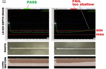 Устройство LD-600 позволяет измерять глубину проникновения лазерного излучения в процессе сварки. После завершения процесса на экране отображается профиль глубины сварного соединения (для наибольшей наглядности масштаб вертикальной оси увеличен примерно в 2 раза). Затем измеренный профиль сравнивается с установленным допустимым максимумом и минимумом. На экране выводится результат (PASS / FAIL). Профиль шва может быть сохранен на ПК для отслеживания качества каждого сварного шва в процессе автоматизированной сварки.