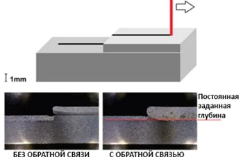 На рисунке демонстрируется процесс сварки, который начинается со стальной плиты и затем переходит на верхнюю пластину толщиной 1,0 мм. На сечении слева сварка выполнена без LD-600 при постоянной мощности. На правом сечении в режиме обратной связи LD-600 быстро увеличивает величину мощности излучения для поддержания постоянной глубины проплавления.