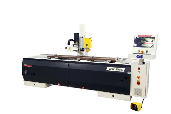 Машина оснащена тремя рабочими блоками. Один блок предназначен для фрезерования замков и петель с помощью фрезерного станка с ЧПУ. Еще два устройства предназначены для двусторонней резки и расточки под углом 45°-90° (CNC Line-X).