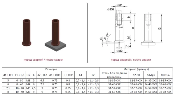 Приварной крепеж для конденсаторной сварки - крепежные изделия (шпильки, втулки, гайки,цанги) из следующих материалов с отличной свариваемостью: