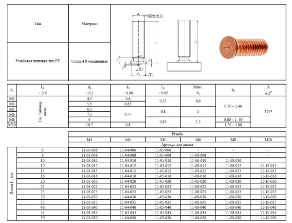 Все стандартизированные сварочные шпильки соответствуют стандарту DIN EN ISO 13918. Не стандартизированные сварочные шпильки поставляются в соответствии с DIN EN ISO 13918. Специальные сварочные элементы, которые не указаны в каталоге, поставляются по запросу.