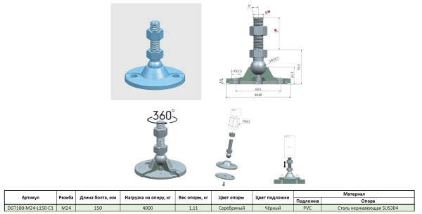DGT100-M24-L150-C1 Универсальная регулируемая опора M24x150 Ø основания 100 мм. Сталь нержавеющая SU