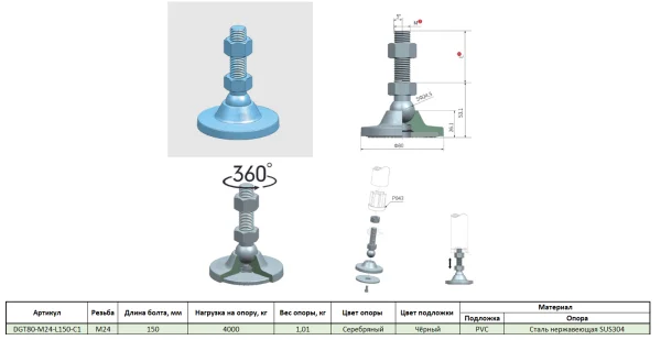 DGT80-M24-L150-C1 Универсальная регулируемая опора M24x150 Ø основания 80 мм. Сталь нержавеющая SUS3