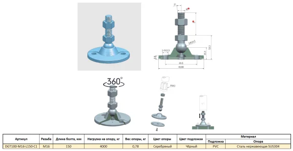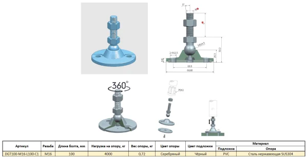 DGT100-M16-L150-C1 Универсальная регулируемая опора M16x150 Ø основания 100 мм. Сталь нержавеющая SU