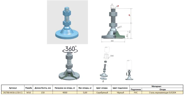DGT80-M16-L150-C1 Универсальная регулируемая опора M16x150 Ø основания 80 мм. Сталь нержавеющая SUS3