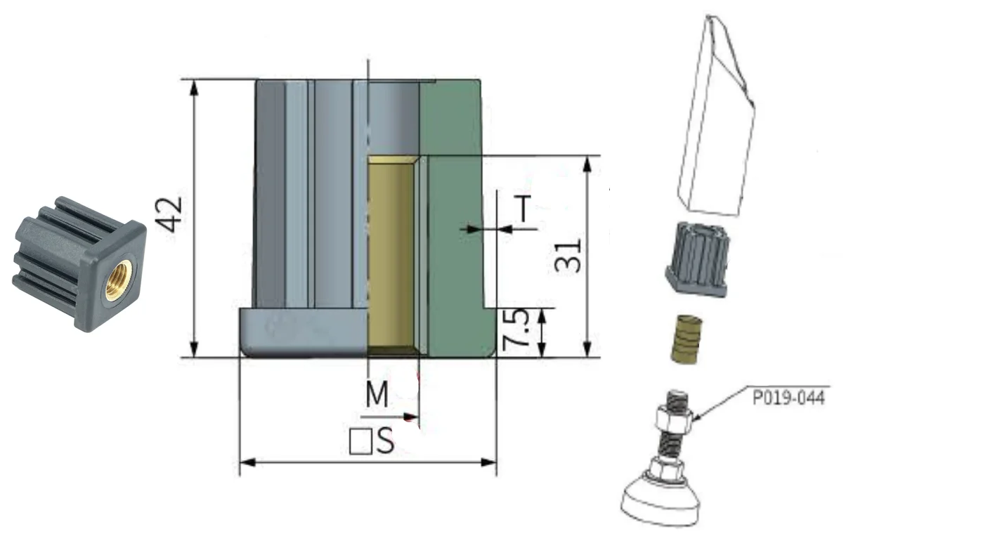 ZJ-FJT-S40-M16-T1,5-C1 Пластиковая вставка квадрат S= 40 мм М16 Т = 1,5 мм. Резьбовая вставка латунь