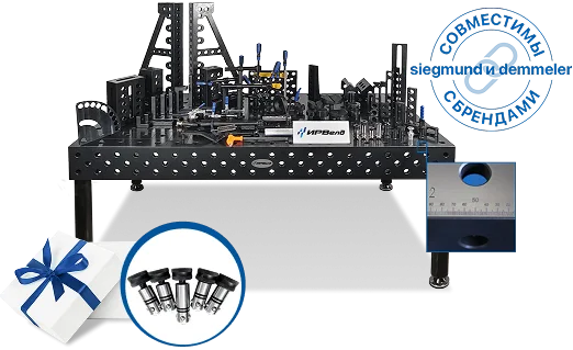 Конструкция стола с системой отверстий позволяет использовать оснастку для точной фиксации свариваемых деталей из нержавеющей стали, алюминия и конструкционных сталей.