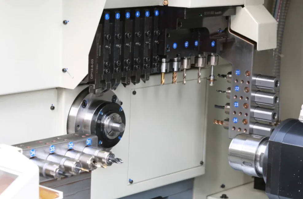 Позволяет обрабатывать детали с двух сторон за один цикл, сокращая общее время производства и повышая точность. - Револьверная головка: