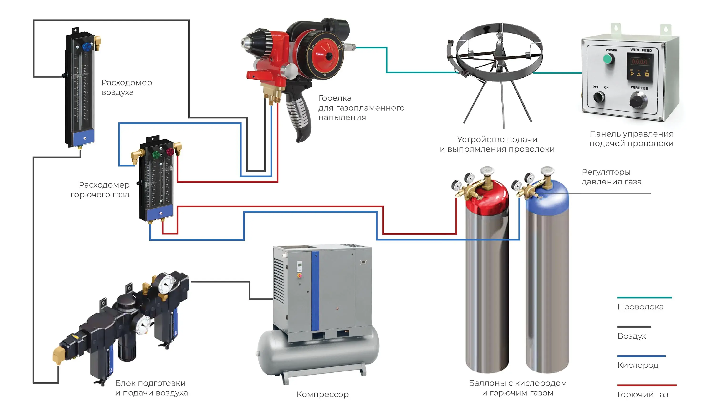 В комплект входит три гибких легких высококачественных шланга высокого давления, оснащенных соответствующими фитингами для подсоединения. Жёлтый (или черный) шланг предназначен для подачи воздуха, голубой — для подачи кислорода, а красный — для подачи горючего газа.