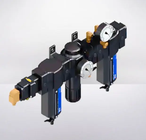 Блок подготовки и подачи воздуха. Оснащен двумя фильтрами для удаления масла и влаги из сжатого воздуха и регулятором давления для регулирования давления воздуха.