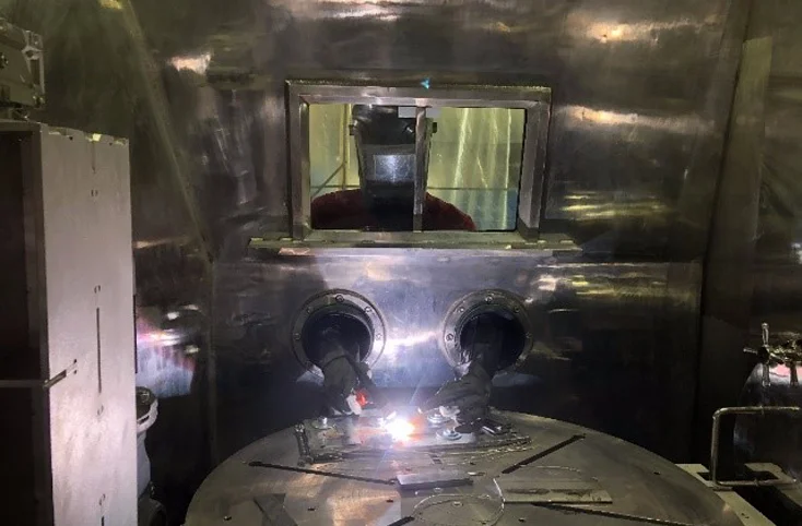 В процессе сварки осуществляется контроль за содержанием примесей H2O, H2O2, и азота в среде аргона внутри камеры.