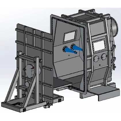 Дверь камеры установлена на откатной каретке. Передняя часть камеры имеет уплотнение для герметичного примыкания двери при вакуумировании. Пневматические шарнирные зажимы обеспечивают надежный прижим двери к камере.