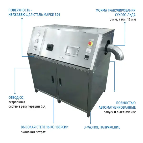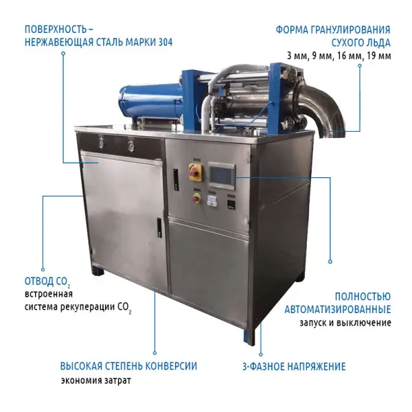 - Генераторы сухого льда — высокопроизводительные установки, способные создавать сухой лед в различных формах (гранулы, блоки, пеллеты), идеально подходящие для промышленного охлаждения, транспортировки и хранения.